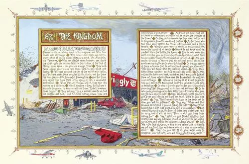 In fact, with every Koranic reference to punishment, Birk includes a corresponding image of America’s violent past and avaricious present. Atrocities in Hiroshima and Nagasaki appear in “Sura 26 a-d.” The cult of political personality is featured in “Sura 61,” while Walmart’s greed and the materialism it inspires are referenced in “Sura 60.”