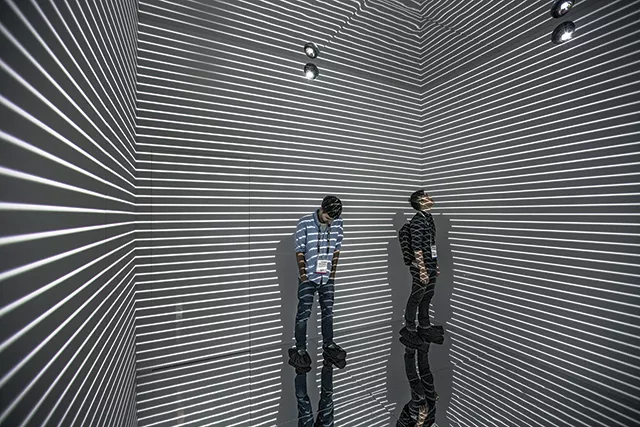 Using contemporary algorithms, light and sound, mirrors, and other methods, the immersive experience transforms a conventional flat cinema projection screen into a three-dimensional, seemingly infinite space. Vice described it as “a room that looks like you’ve just stepped into some kind of otherworldly portal or cosmic gateway, as the swirls, curls, and linear forms cause the walls to melt away.”