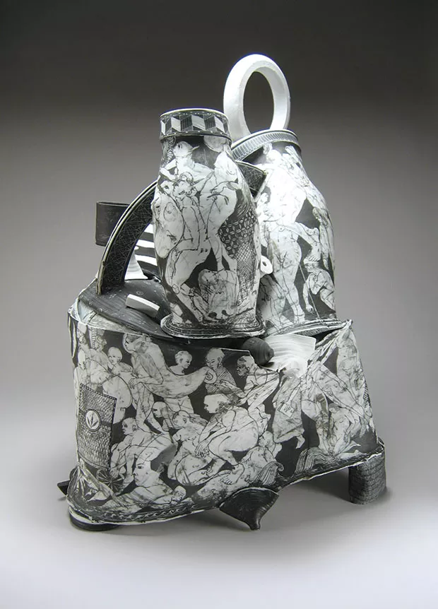 Edward Eberle Retrospective, at Contemporary Craft, is one of the more beautiful solo exhibits I’ve seen in recent years. Eberle is a nationally recognized, Pittsburgh-based ceramacist best known for his architecturally shaped works in porcelain, embellished with images in black and white terra sigillata. The show traces three decades, from his early works with mostly figurative imagery on more traditionally shaped vessels to later, larger and increasingly abstract images and forms.