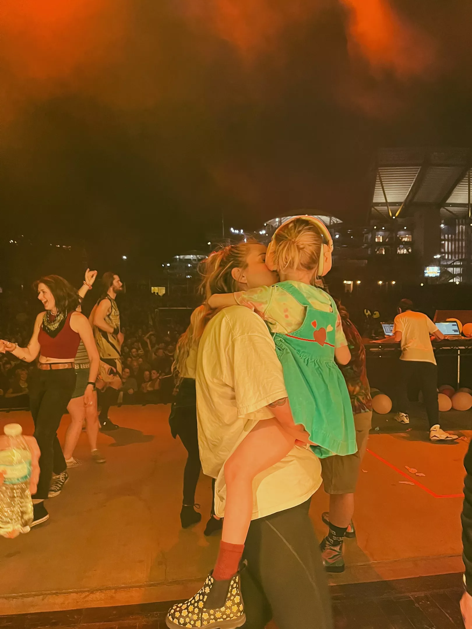 Gregg Gillis’ daughter Remy on stage with his wife, Kendall Bieselt, during a Girl Talk show at Stage AE in 2022. Credit: Photo: Sara McElhaney