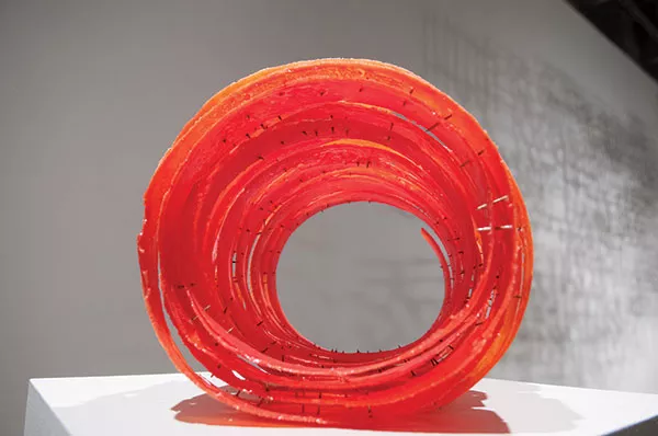 Sculptural works approach the organic in either duplication or evocation of the natural world. Cheryl Wilson Smith’s “Writer’s Lichen” would not be out of place deep within the woods or on the ocean floor, and Rei Chikaoka’s “Release” is a luscious spiraling coil of blood-orange and papaya juiciness — fresh, glistening, and enticingly ripe, but pricked with bits of metal. Conversely, Gina Zetts’ “The Apartment” hails manmade constructs in its doll-sized interior, crafted with painted wallpaper, hardwood floors, a single window and a cozy armchair.