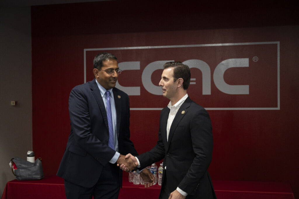 Rep. Arvind Venkat and Congressman Cris Deluzio shake hands at CCAC on Sept. 24, 2025. Credit: Mars Johnson