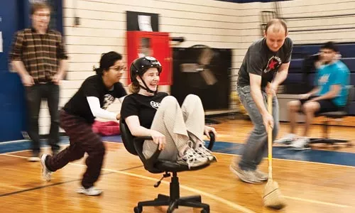 “We’re inventing as we go,” Nelson says. For example, there was early debate about “pumping” — whether players were allowed to gyrate their bodies to guide the chairs and keep them moving. Refining the game seemed more essential than winning; Nelson even had to remind the teams to keep tallies. “Keep track of your scores!” he called out after 15 minutes of play. “Or at least who wins the round!”