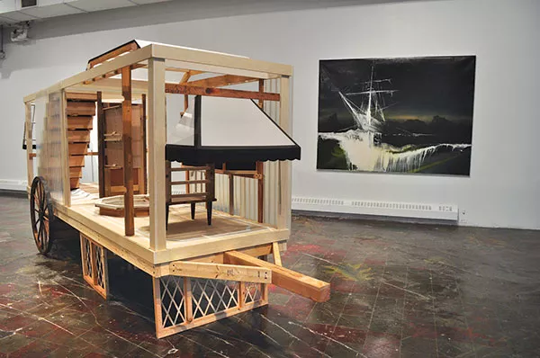 The works most immediately commanding of attention are those by Chele Isaac and BA Harrington, in part because they demand it physically. The largest single work in The Mountain and the Bumblebee is “Mo Ho (the horses died, but the wagons rolled on),” a plywood and mixed-media cart dominating the midsection of the gallery, the unfinished plywood joined with carved and painted rungs, designed for motion but stationary, filled with possibility but currently impotent. (A version of the work was recently exhibited at Pittsburgh Center for the Arts.) In one gallery window rests a smaller cart, and in another sit coffin-like crates, seemingly unadorned and plain but with monitors with looping video inside. A kneeler like those found in houses of worship holds a screen with segments of rodeo, with long shots of cowboys and close-ups of cows. “American Quartet,” the loudest piece in the exhibition, with sound created by Jack Kellogg, is a four-channel video by Isaac (and which was also recently seen at the PCA). The video follows a man toting a battered suitcase across deserts equally abused, littered with stained mattresses and plastic tumbleweeds, empty bottles and overflowing trash bags. The scene is disappointing and disquieting but interrupted by skies and sands of such majesty they restore hope. In the show’s other video work, Josh Reiman’s “A Brief Inquiry,” rugged characters stride across equally rugged environs, investigating the concept of “the sublime,” along with its misinterpretation and corruption.
