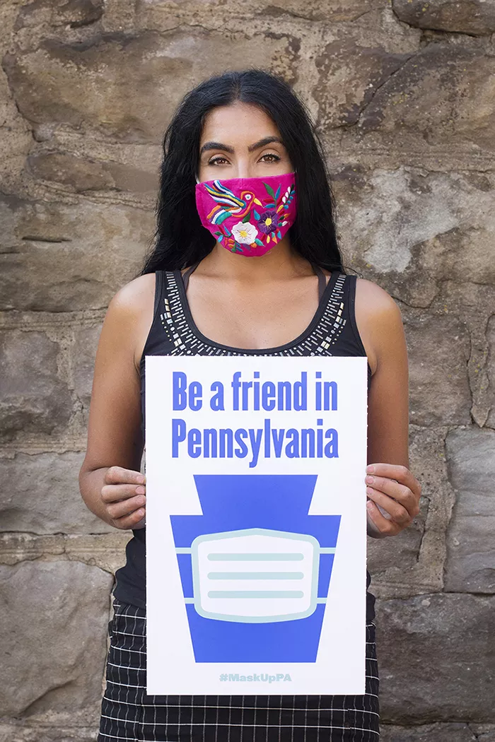 So “You’ve got a friend in Pennsylvania” became “Be a friend in Pennsylvania,” accompanied by Larkin’s design of a mask on top of a keystone, and 100 silk-screened #MaskUpPA posters were printed at CommonWealth Press.