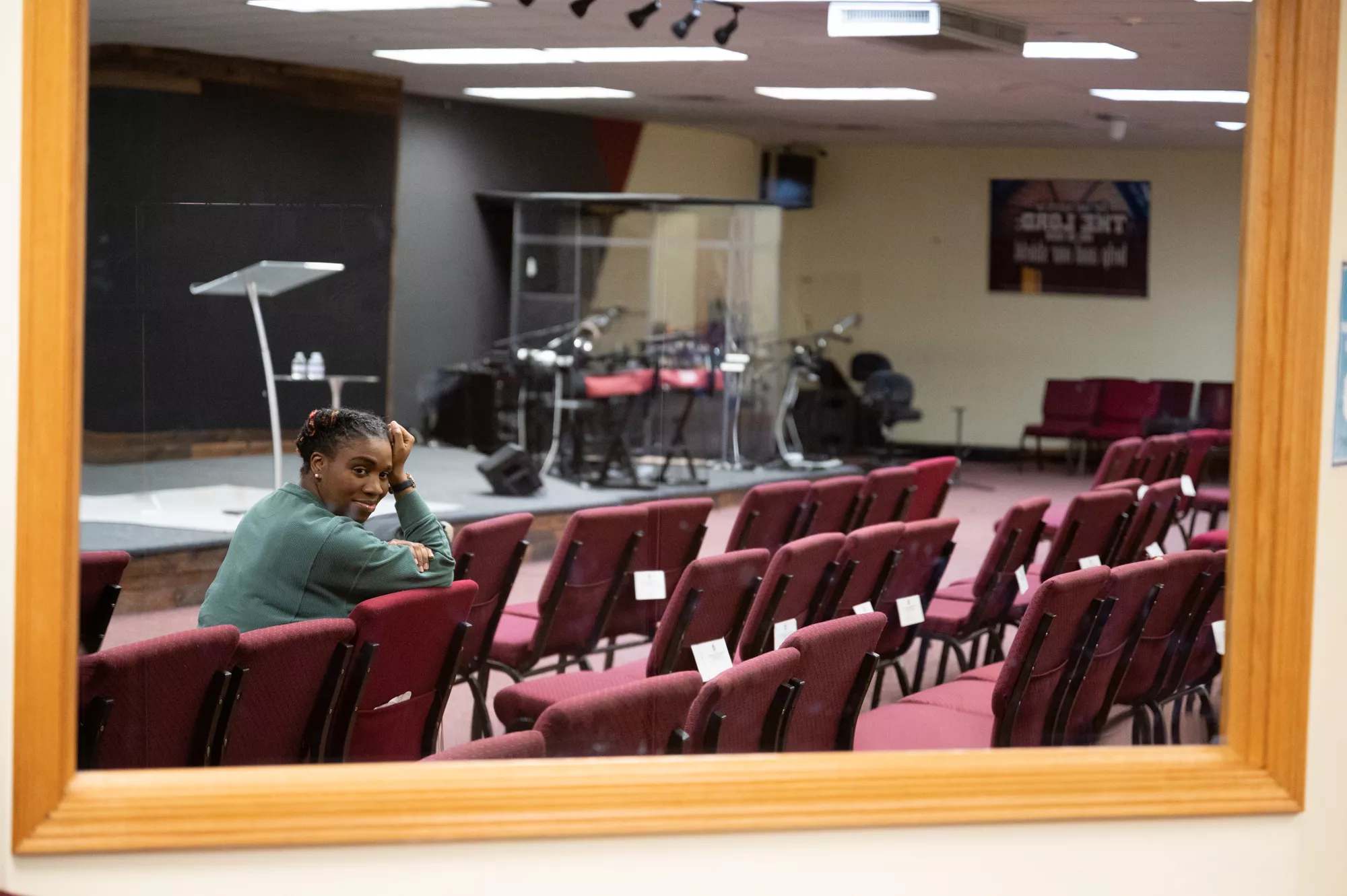 A woman with braided hair wearing a sweatshirt sits in a small academic presentation room with fixed rows of seats
