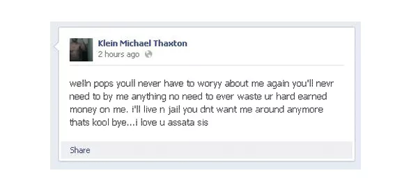 Sept. 21: Klein Michael Thaxton updates his Facebook page frequently while holding a hostage in Three Gateway Center. Among his posts: “i cant take it no more im done bro,” and: “how this ends is up to yall bro real shyt”. After five hours, Thaxton releases his hostage unharmed and is arrested.