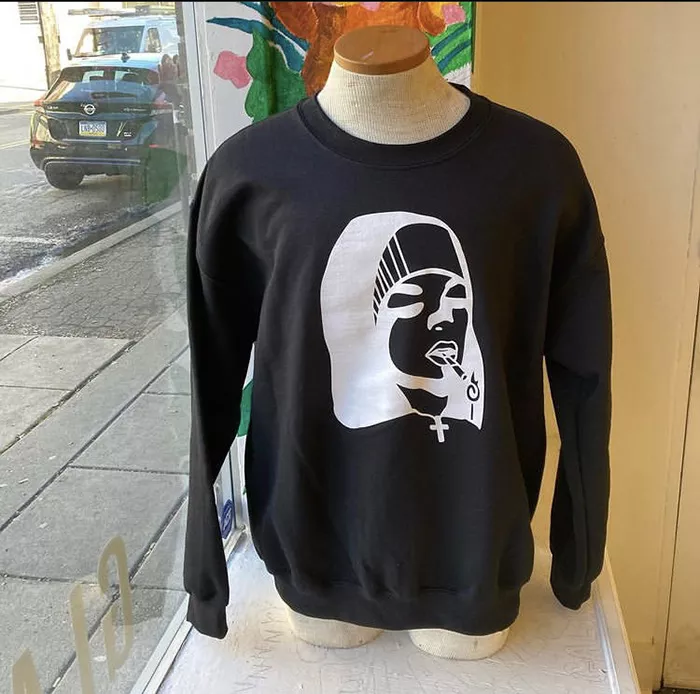 Since its opening in July 2020, Curated Flame has sold limited-edition sweatshirts and hats featuring a smoking nun — created in partnership with Maria Coughanour of Ethereal Studio — and stickers by Kira Hovanec — most notable for the @celebfoodiesonthebreadcarpet Instagram account where she posts punny drawings combining celebrities and food. An irreverent Bong Dxck Energy/Statue of David sticker, conceived with Curated Flame’s in-house artist Single Spirit, reimagines Michelangelo’s famous sculpture holding a joint, with his private parts replaced by a bong. Rabinovitz has also worked with tattoo artist L. Hammel, aka Math Goth, multimedia artist Darrien Burke, and others.