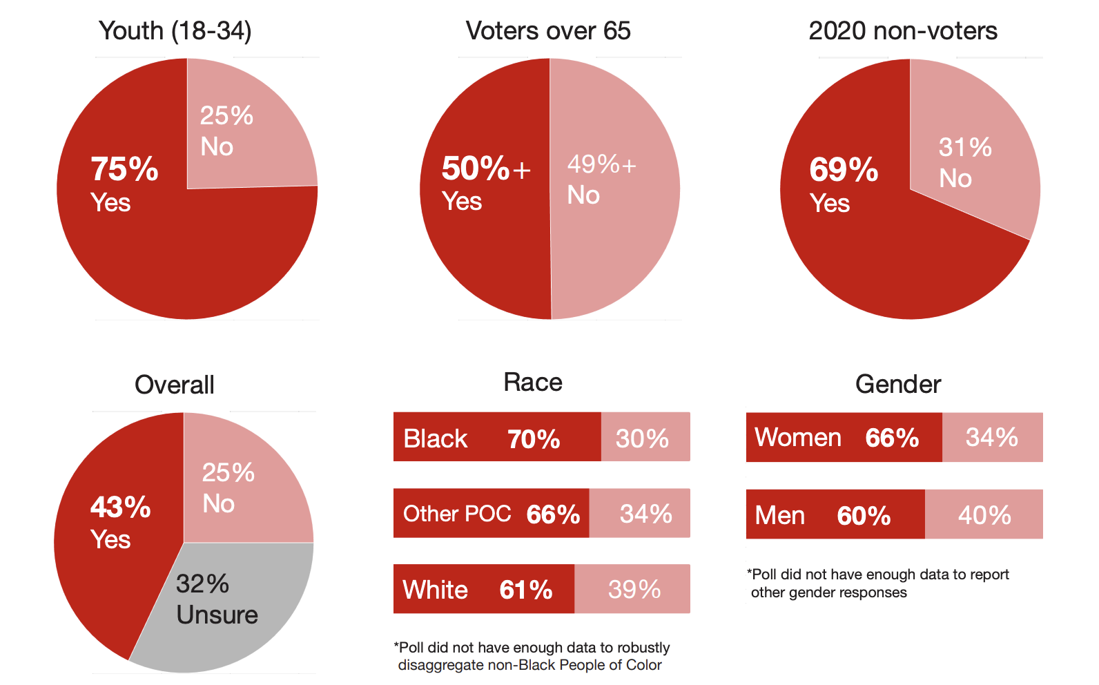 Although a majority of every demographic breakdown according to race, age, and gender supported the referendum, Black voters were the most likely racial group to support it, at 70%, and women were more likely than men to approve of the proposed referendum, which was presented in full to respondents.