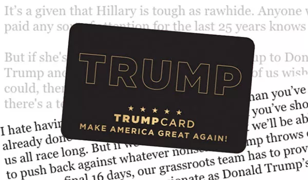 The Trump campaign wanted to give me something for my donation. The note read: “Receive your gift now. Friend, to receive your free personal gift from Mr. Trump, you must donate by 11:59 PM TONIGHT.” But there was nothing that explained what the gift was. However, another email did promise a specific gift — an “exclusive, non-transferable, invitation-only opportunity to receive a limited edition Trump Black Card.” My initial reaction was: “A Trump Black Card!?!?! Well, sign me up, because I can use some help with my holiday shopping.” But I realized that it was just a card to show that I’m going to proudly vote for Trump. I was going to write back and decline, because I don’t even plan to shamefully vote for Donald. But then I realized that in the eyes of the Trump machine, I’m special: “Who will be carrying this card? Only those who want to make a strong statement in this election,” the message promised. “You’ll be on a team that will be sending a message to Crooked Hillary to watch out, that we’re coming for her.” But I realized I was actually on Crooked Hillary’s team, so I decided not to get the card. I knew that Mr. Trump wouldn’t put up with anyone dishonest carrying his card.