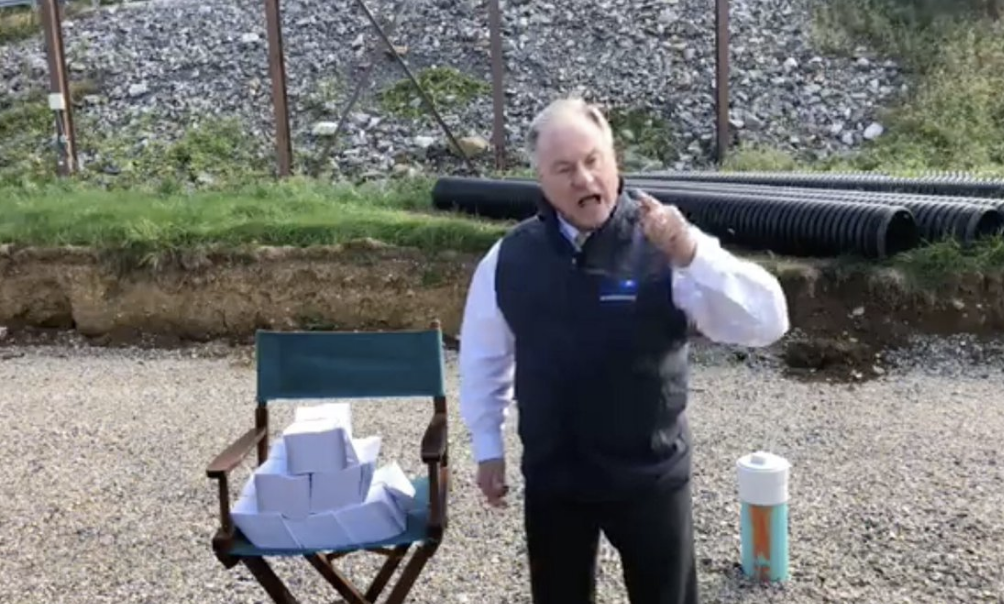 “I’m standing in front of a billboard that Tom Wolf and his Democrat cronies have put up,” says Wagner, pointing to the billboard, which reads “Scott Wagner’s Penn Waste sued 6,979 Pennsylvanians” and encourages people to go to the website of Penn Waste Alert.