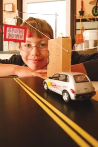 The device is only a model for now, but designer and seventh-grader Langston MacDiarmid says it could be put to practical use to stop cars from flying down Main Street. If anyone ever does build it to full scale, he says, there are certain kinks they’ll need to work out, like making sure the sign doesn’t crash into the car’s front windshield.