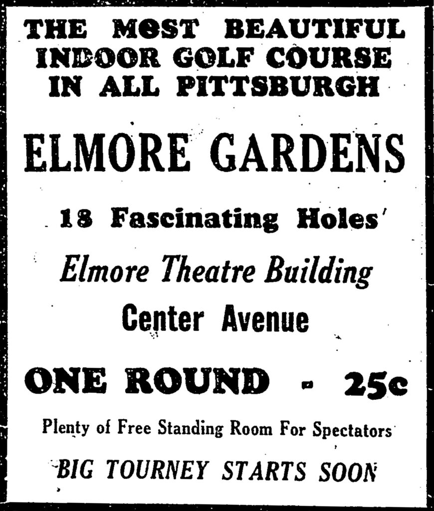 The Elmore’s shine dimmed in less than a decade. The silent movie theater hadn’t upgraded to “talkies” and became a rundown cinema relic. In 1930, Elmore Gardens opened inside the building. It was one of several indoor golf courses operated in Pittsburgh during the first half of the 20th century.