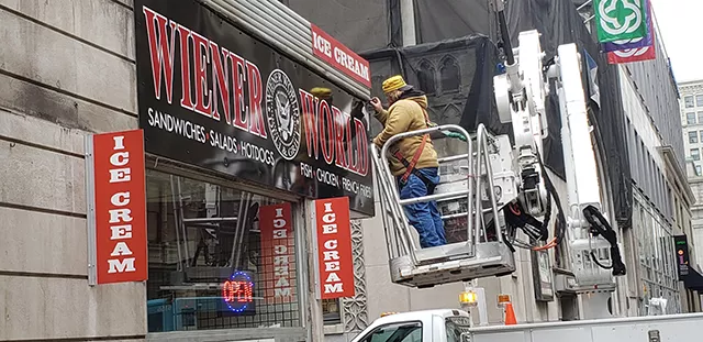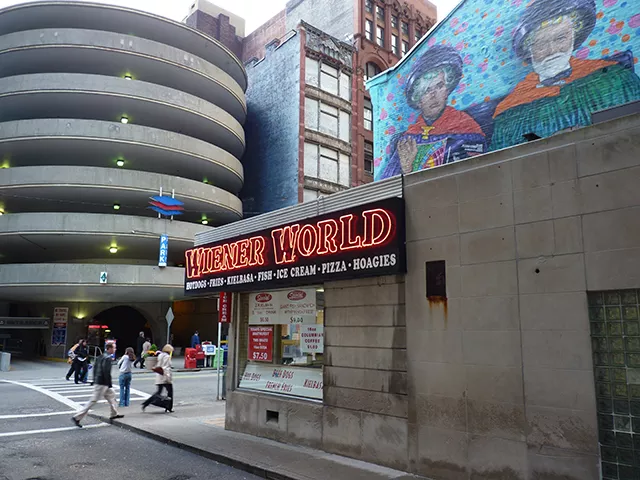 The red neon glow of the Wiener World sign could be seen everywhere. For decades, it was a landmark on Smithfield Street in Downtown Pittsburgh, casting pink hues on the “Two Andys” mural that rested just above its perch on Strawberry Way. The sign could be spotted during car chase scenes in Hollywood blockbusters like The Dark Knight Rises and Jack Reacher.
