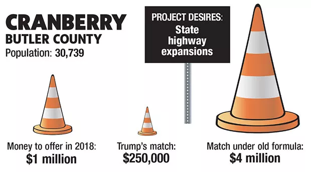 Cranberry Township manager Jerry Andree told CP the Butler County township has been working diligently to expand Freedom and Rochester roads, as a way to accommodate Cranberry’s booming population. Cranberry plans to allocate significant dollars to these projects, but even so, the township wouldn’t come close to funding those projects under Trump’s proposal. “Local municipalities simply do not have that kind of local funding to help with transportation improvements on state highways,” wrote Andree in an email to CP.