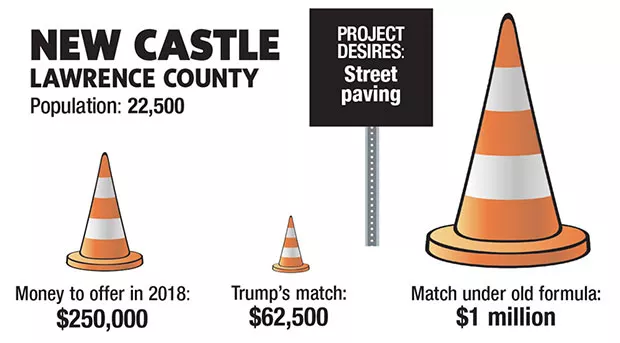 New Castle is a Lawrence County city that could really use some help. It’s still under Act 47 Financial Distress, where the state oversees its spending, and its budget allocates a relatively small amount for road paving considering its population size. As a rural town, New Castle could benefit from getting some of the $50 billion in rural block grant program money proposed by Trump. However, that grant only applies to “innovative” infrastructure projects, and New Castle officials indicated to CP that they’re focused on everyday improvements, like repaving roads.