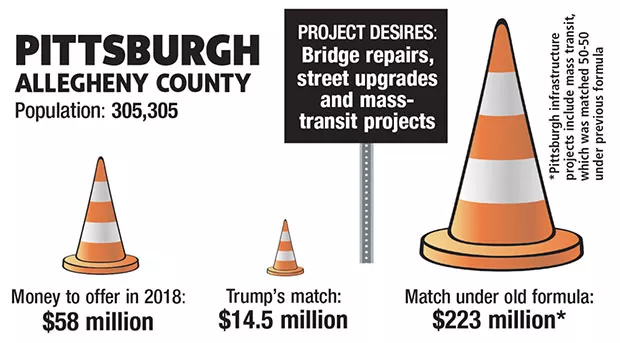 Peduto spokesperson Tim McNulty wrote in an email to CP that Pittsburgh needs to complete “all kinds of bridge, street, transportation and transit projects.” But he doesn’t think Trump is really offering any help. “Under the president’s proposal, the federal match for infrastructure projects would be boiled down to next than nothing,” wrote McNulty.