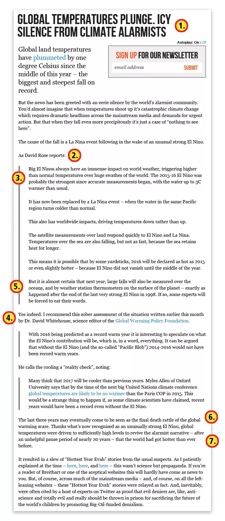 1The world’s climate researchers overwhelmingly agree that climate change is real, man-made and happening now. But this snarkily written piece, complete with sensational headline, cites an article in British newspaper The Mail on Sunday to argue that climate change is the province of “alarmists.” The Breitbart story was widely shared, and the subject of an approving tweet by the climate-denying U.S. House Committee on Science, Space and Technology