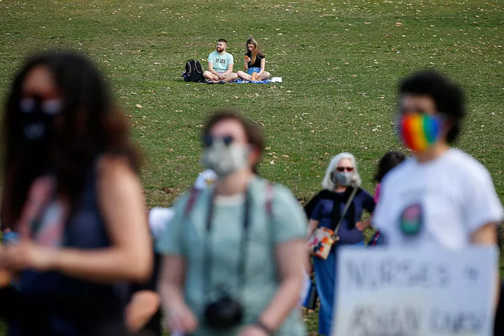 The crowd reached Schenley Plaza around 4:50 p.m., where many students were picnicking and sunbathing. The more than 400 rally attendees spread out in a circle, interspersing with some of the people already there. Dang encouraged people to socially distance, which was difficult in the small space, although most attendees wore at least one mask.