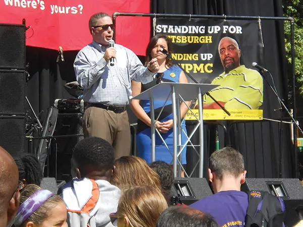 Also being served: a heaping dose of resentment for what speakers alleged were UPMC’s “bullying” tactics, like its resistance to the SEIU’s organizing drive, and its refusal to negotiate a new contract with Highmark.