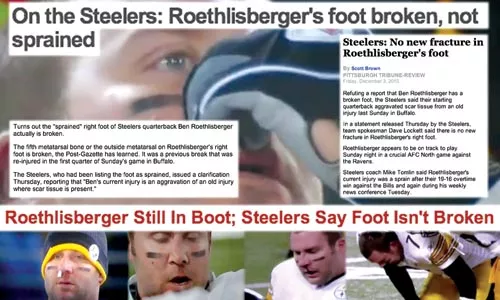 The Tribune-Review trumpeted that the Steelers were “[r]efuting a report that Ben Roethlisberger has a broken foot,” and claiming that the quarterback had merely “aggravated scar tissue from an old injury.” After the Ravens game, the paper referred to the foot as “sprained.”