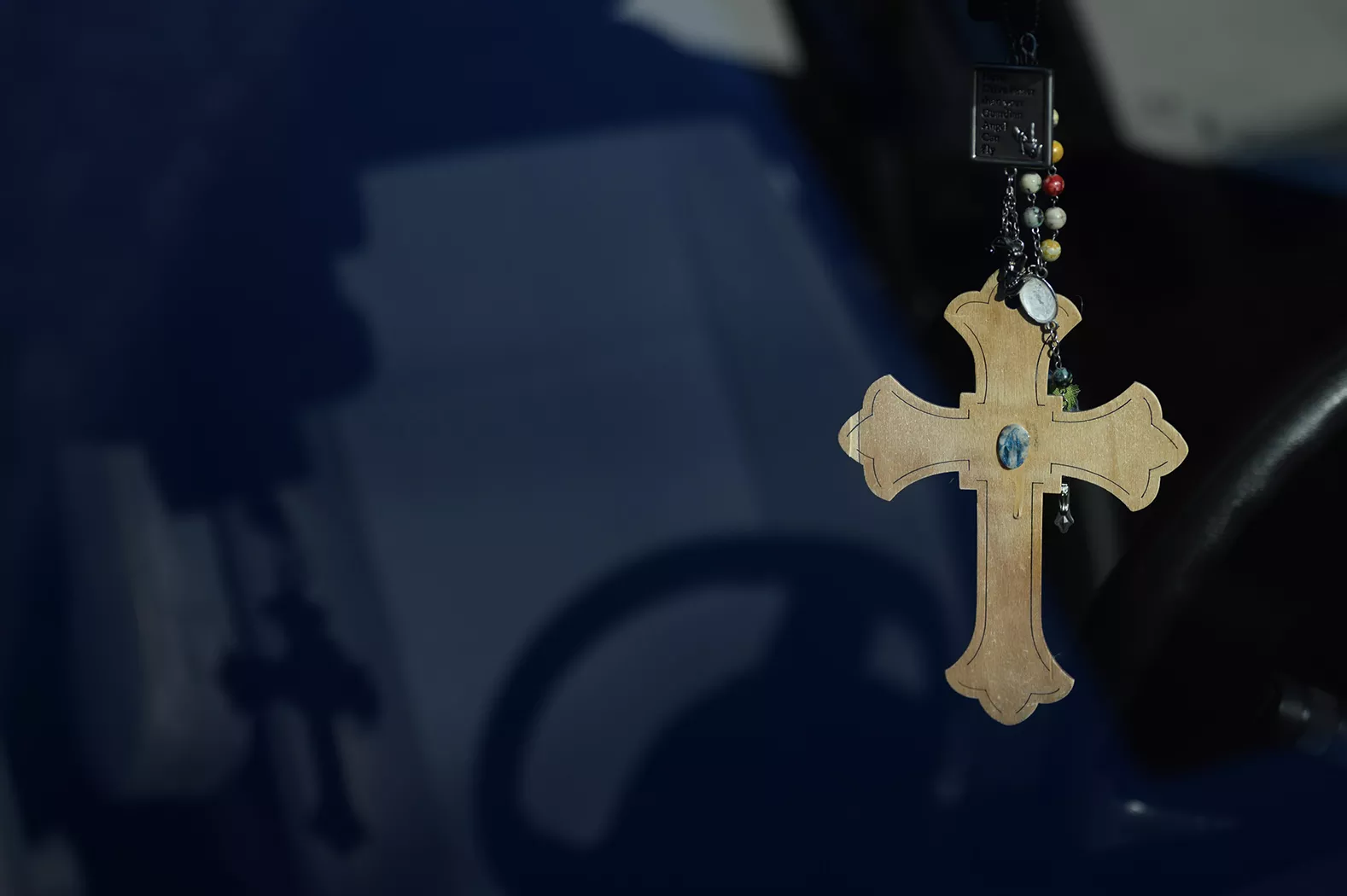 A cross hanging on a car’s rearview mirror parked in the Newman Center parking lot Credit: CP PHOTO: Mars Johnson