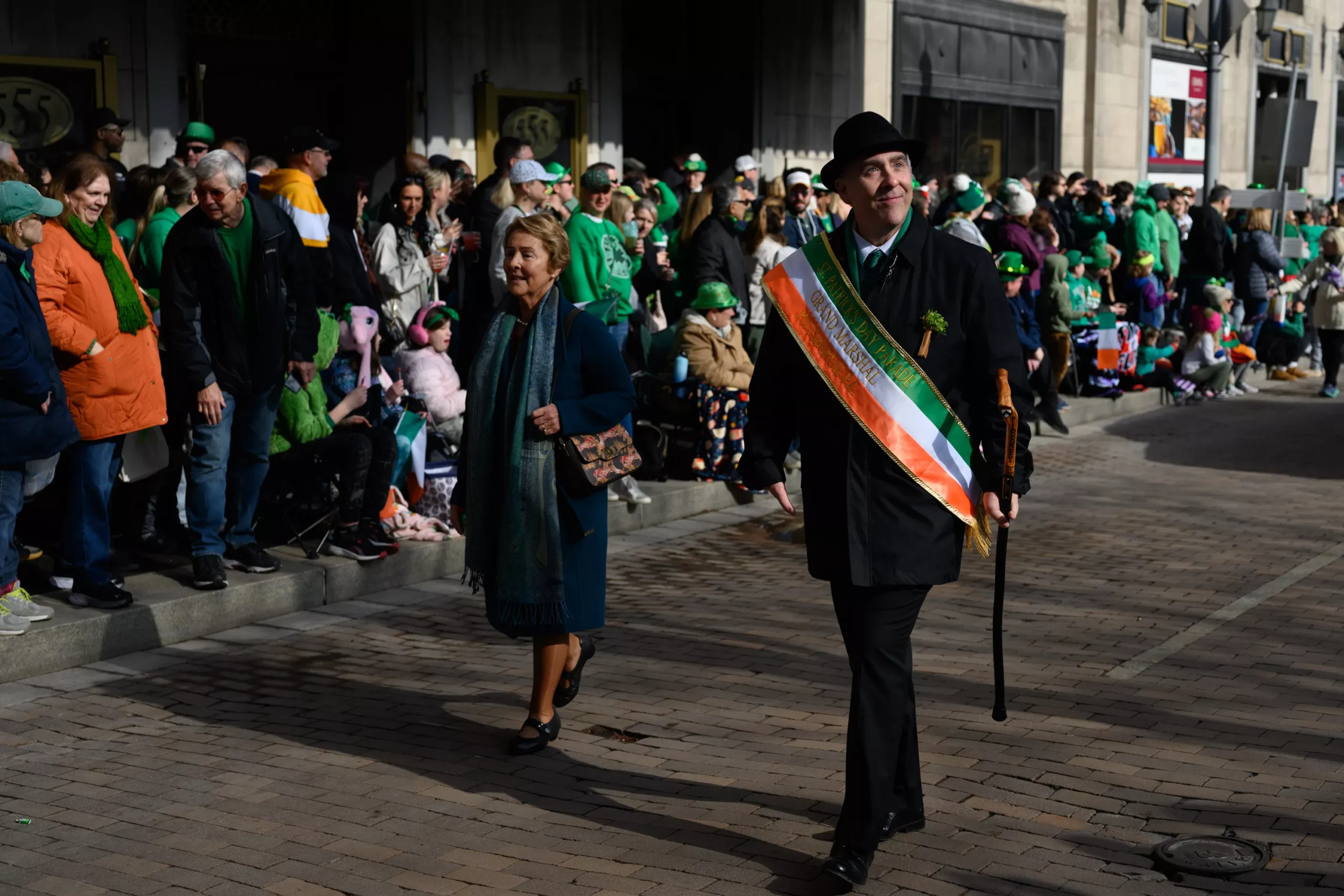 The parade grand marshall, Robert Tierney, leads the 2024 St. Patrick’s Day parade in Downtown Pittsburgh. Credit: Mars Johnson