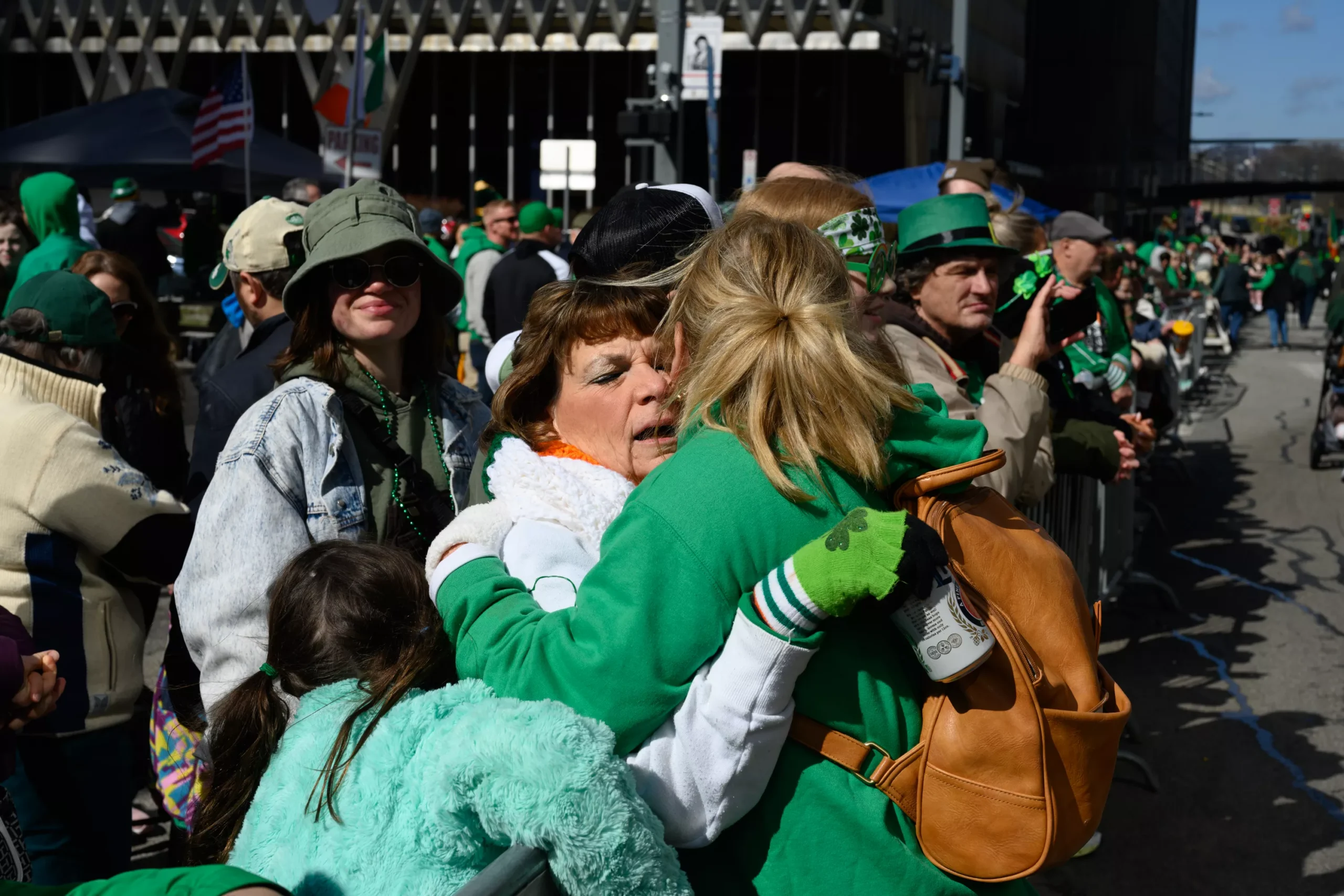 Peggy Teets hugs Ruth Macken during the St. Patrick’s Day parade in Downtown Pittsburgh on March 16, 2024. Credit: Mars Johnson