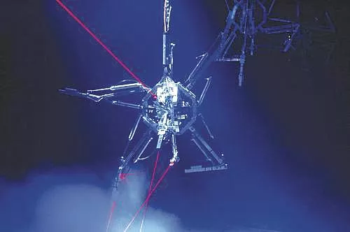 Hysterical Machines, created by Montreal artist Bill Vorn, is like the set for a sci-fi horror movie, where spidery, orb-bodied robots hover in space and jitter noisily. Their metal limbs flex and stretch, like deranged dental tools. Because they are anchored in place, the machines are easy to avoid and even walk between, but there is something threatening about their movements. Step too close and you can expect a steel karate chop, or at least a lamp shining in your face.
