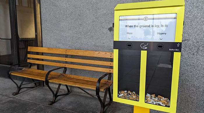Thus, the latest initiative in the fight against litter in Pittsburgh: Ballot Bins that ask people to vote with their cigarette butts to answer yinzer-themed questions. Is it soda or pop? Washington or Worshington? Are pierogies tastier when prepared soft or crispy?