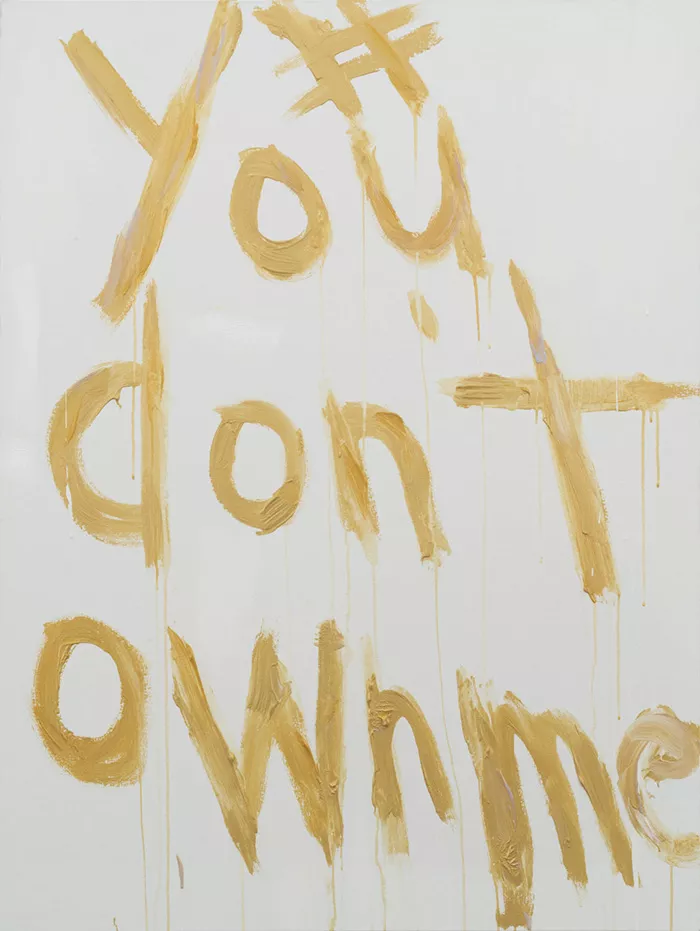 This treatment was revisited in 2017 with the Hashtag series, gritty black paint replaced with gold glitter and handles subbed with slogans “#PussyGrabsBack,” “#Thisisillegal,” “Youdon’townme,” and, simply, “#”. At first glance they can be read as a show of support for the #MeToo movement and the women speaking up and out, but it’s much more complex than that. The series examines the reduction of uprising into bite-sized catchphrases, easily digested or regurgitated, packaged for easy distribution. The guts remain below the surface, beneath first sight, prompting us not to be satisfied with the quick encapsulation, but to delve deeper.