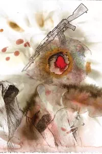 The couple dozen pieces flat against the walls resonate with echoed images which skillfully evoke fear, desperation, pain and confusion. These are portraits of what happens when unforeseen disaster, born of nature, merges horrifically into a catastrophe resulting from the inattention of man. Double-helix strands of DNA creep heavenward to become writhing serpents and cocked guns; angels and devils challenge soldiers and icons. A few works explode in heartbreaking text that spirals inward upon itself: “God bless us … we need water and food … we have a sick baby.”