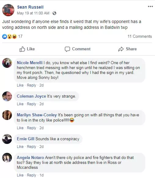 Incumbent Denise Ranalli Russell (D-Brighton Heights) is running for re-election against Bennett. On May 19, her husband Sean Russell posted on Facebook, “Just wondering if anyone else finds it weird that my wife’s opponent has a voting address on north side and a mailing address in Baldwin twp.”