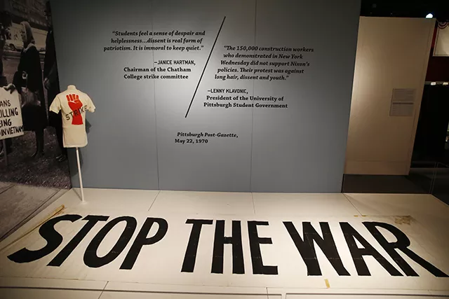 The growing fatigue and disillusionment with the war are chronicled as the exhibit goes on. In 1972 a large Stop the War banner was unveiled during the Pirates Opening Day at Three Rivers Stadium. Washington & Jefferson College in Washington County helped anti-war protests. Anti-war sentiment started to combine with the Civil Rights movement of that era, and the Heinz exhibit shows how that splintered folks in Southwestern Pennsylvania. Union leaders joined anti-war and civil rights protests, but the exhibit notes how few white, working-class union members followed suit.