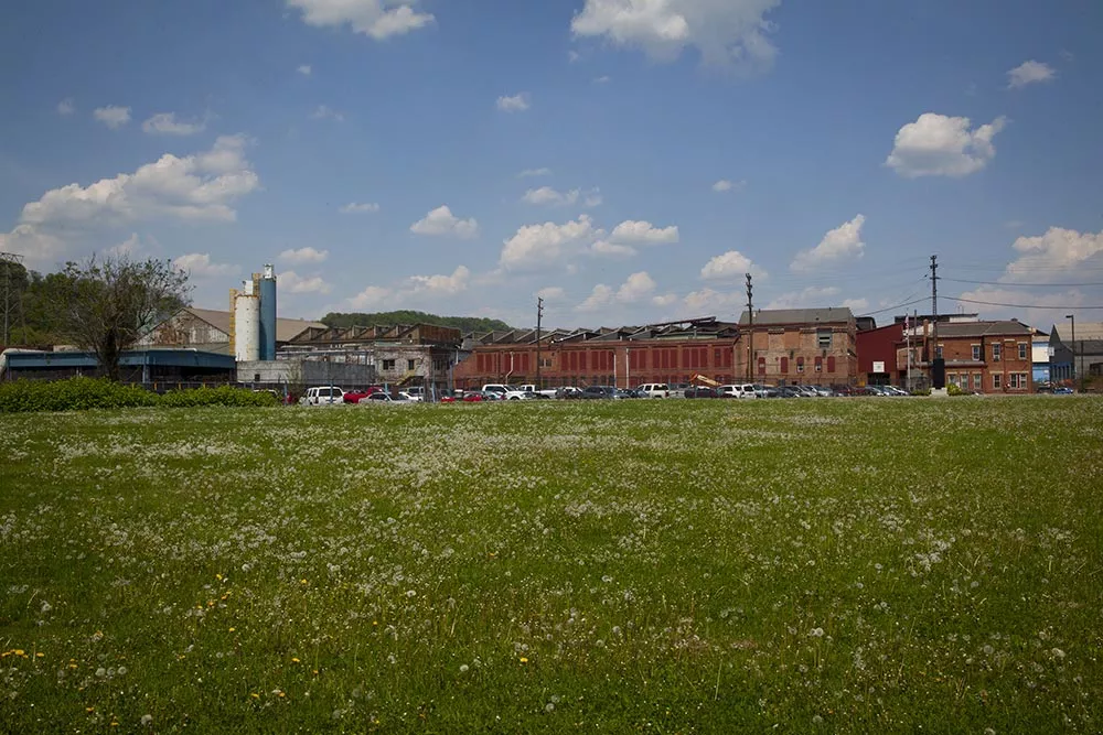 A panoramic view shows new condo development across from riverfront industry along Hatfield Street in Lawrenceville.