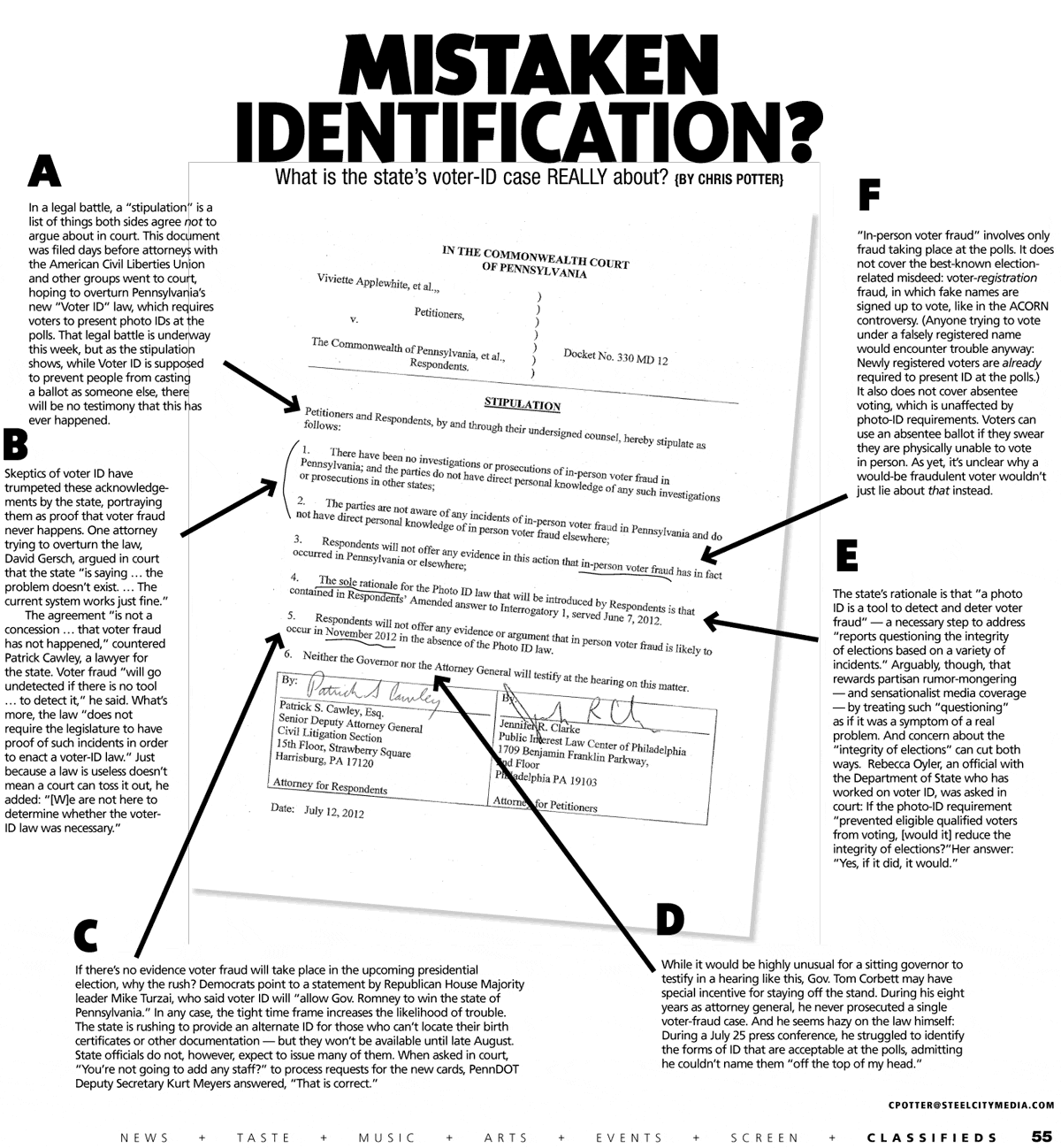 In a legal battle, a “stipulation” is a list of things both sides agree not to argue about in court. This document was filed days before attorneys with the American Civil Liberties Union and other groups went to court, hoping to overturn Pennsylvania’s new “Voter ID” law, which requires voters to present photo IDs at the polls. That legal battle is underway this week, but as the stipulation shows, while Voter ID is supposed to prevent people from casting a ballot as someone else, there will be no testimony that this has ever happened.