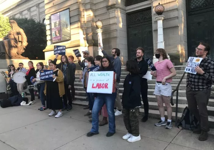 USW demonstrators call for higher wages outside the opening gala of the 58th Carnegie International exhibit. Credit: Provided by Guillermo Perez