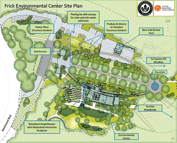 The new Frick Environmental Center, planned by the Pittsburgh Parks Conservancy, has been designed to meet cutting-edge environmental standards, including the Leadership in Energy and Environmental Design (LEED) Platinum certification and the Living Building Challenge. The green facility will be net-zero energy and water, feature a geothermal heating and cooling system, and include recycled wood.