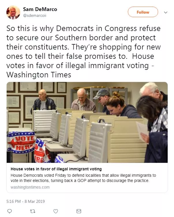 In March, DeMarco tweeted that Democrats were “shopping for new [constituents] to tell false promises to. House votes in favor of illegal immigrant voting.” The accompanying link shares the same headline, but the story is about House Resolution 1, a campaign finance bill. Right-wing pundits and politicians claimed this bill expanded voting rights to non-citizens, but FactCheck.org said these claims were false.
