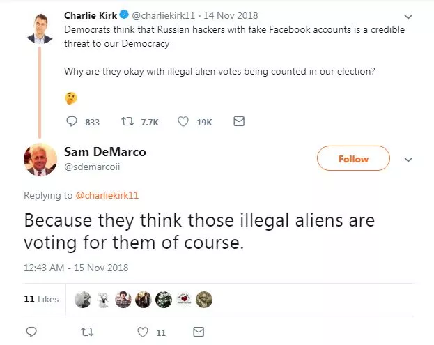 In November 2018, DeMarco replied to a tweet by right-wing provacateur Charlie Kirk, in which Kirk wrote, “Why are [Democrats] okay with illegal aliens votes being counted in our elections?” DeMarco replied with “Because they think those illegal aliens are voting for them of course.”