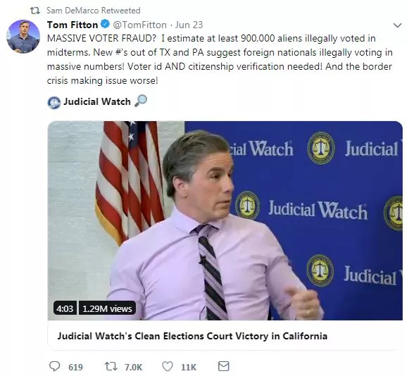 In June of this year, DeMarco retweeted a tweet from Tom Fitton, the president of controversial right-wing nonprofit Judicial Watch. The tweet claimed that 900,000 undocumented immigrants voted in the 2018 elections. According to the New York Times, courts have dismissed the vast majority of Judicial Watch’s lawsuits.