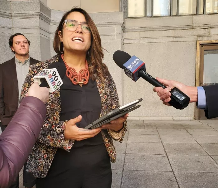 State Rep. Sara Innamorato on the steps of Pittsburgh’s City-County Building in Downtown Pittsburgh on Wed., Oct. 12, 2022. Credit: CP Photo: Jamie Wiggan