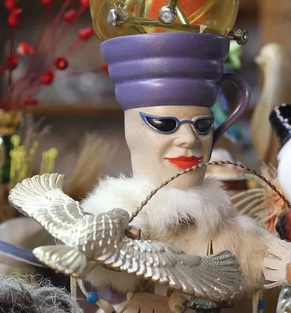 In creating what he describes as vignettes, Bubash’s art-making material of choice consists of plastic toys, souvenirs, used tattoo needles (what else you gonna do with them?), mementos, bric-a-brac and all manner of mostly smallish whatnots. Some of it is campily collectible, some of it upcycled but a step ahead of the landfill. While generally retaining their recognizable identity, these items are carefully accumulated in an unself-serious way that variously recognizes interpretations, counters interpretations, suggests new interpretations and confounds interpretations, all the while creating satisfying sculptural forms. In other words, Bubash complicates the act of “reading” symbols, much as does a swastika on a punk musician (unlike a swastika on a skinhead). In assembling the components, pieces are generally stacked vertically, resulting in small monuments to nothing in particular — pedestal pieces without the pedestals, rebels without a cause other than (I’m guessing) a measure of skepticism regarding the status quo.