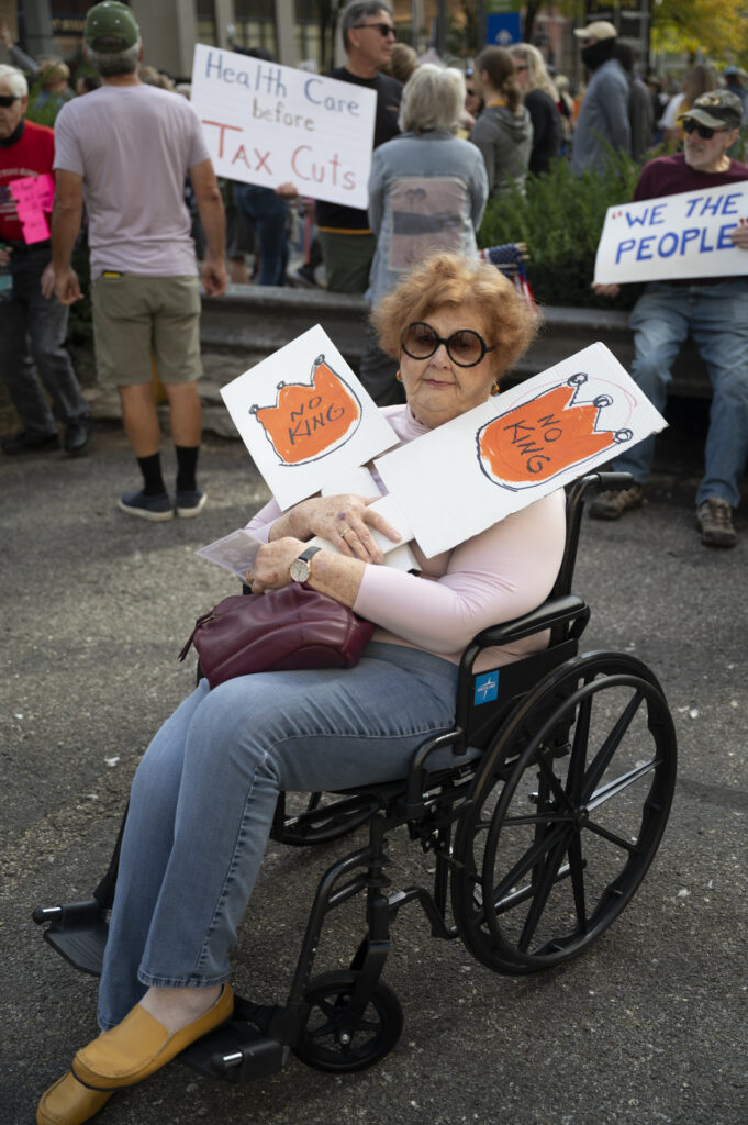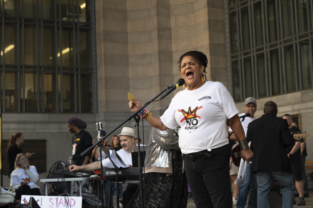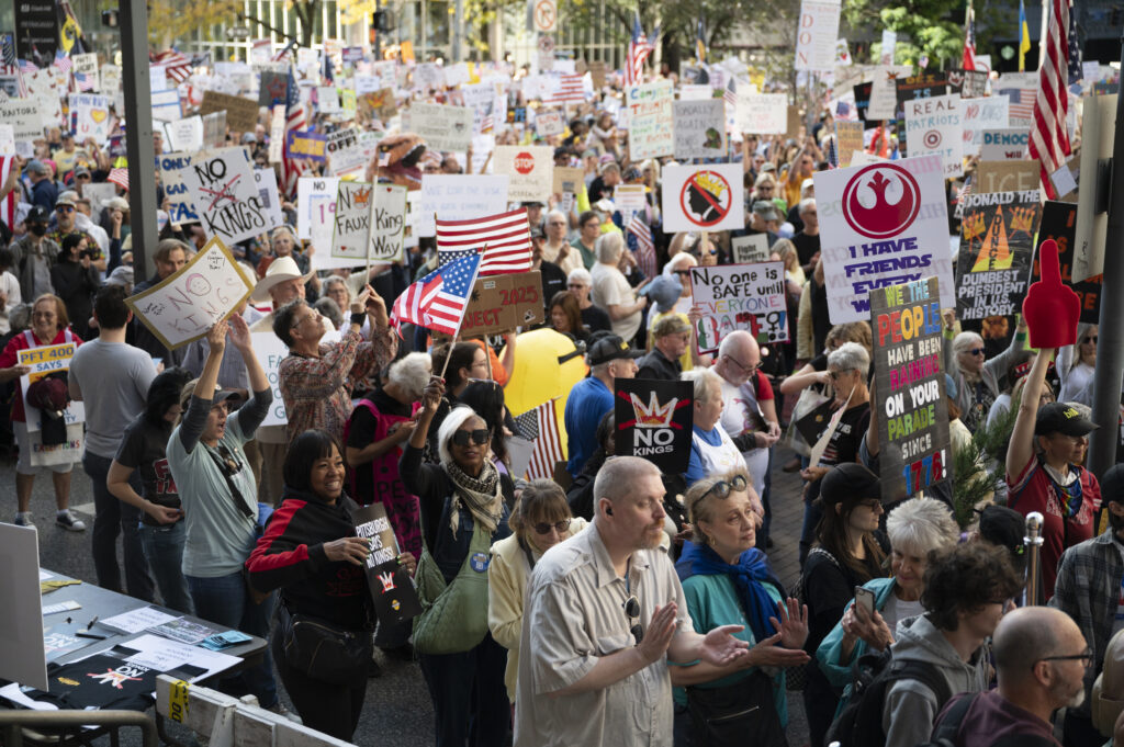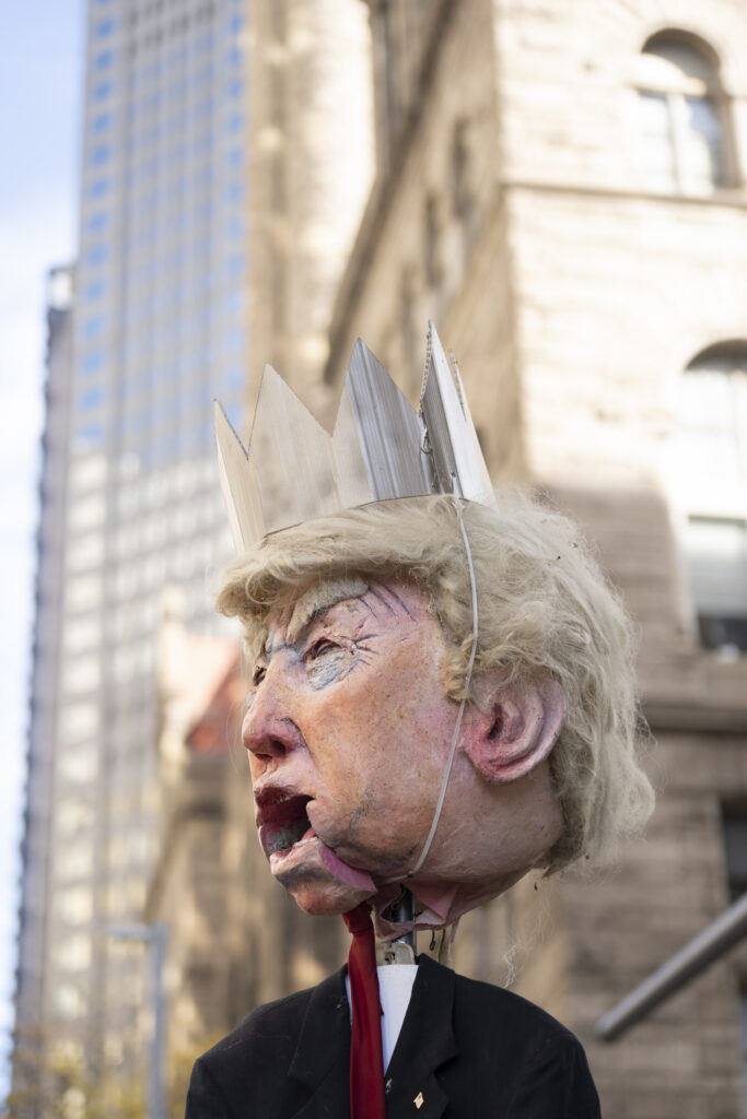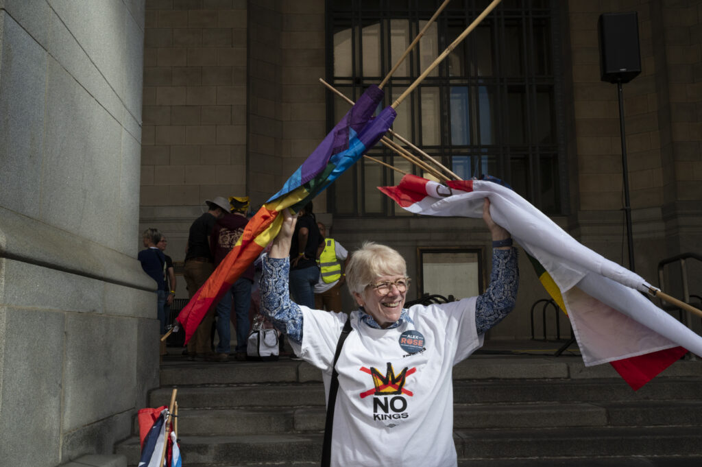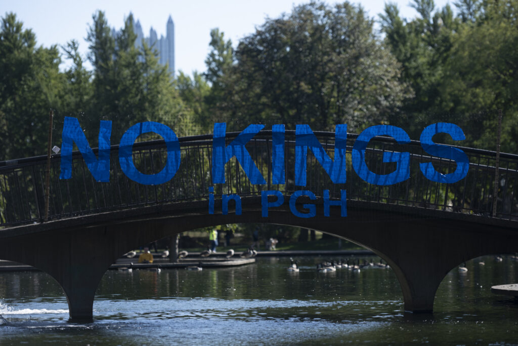 Pittsburgh joined in on the nationwide ‘No Kings’ protests today, with thousands gathering in front of the City-County Building downtown and Allegheny Commons Park on the Northside. The downtown protest, organized by Indivisible Pittsburgh, featured remarks from Congresswoman Summer Lee, County Executive Sara Innamorato, Congressman Chris Deluzio among other local leaders. Protesters filled Grant St. to rally against the Trump administration and hear from local activists and musicians by 1 p.m. before marching to Mellon Square. The protest on the Northside, organized by 50501, also drew a large crowd of people, some dressed in animal costumes holding signs that read “No Kings in Pittsburgh” and “Grab him by the Epstein files.” Jaime Martinez of Casa San José spoke on the many injustices he has noticed in the community surrounding ICE and the importance of standing up for your neighbors.