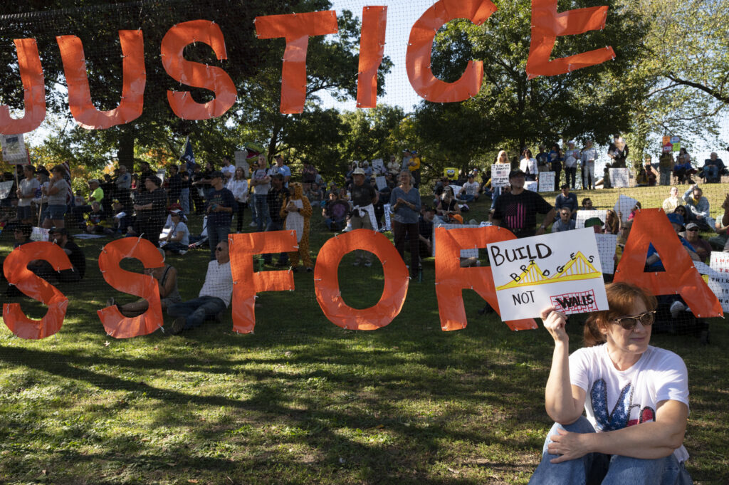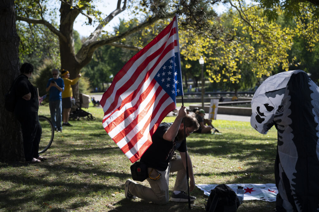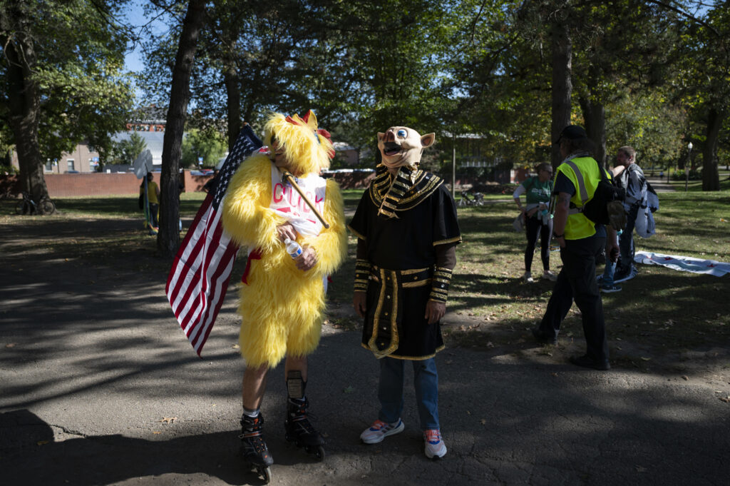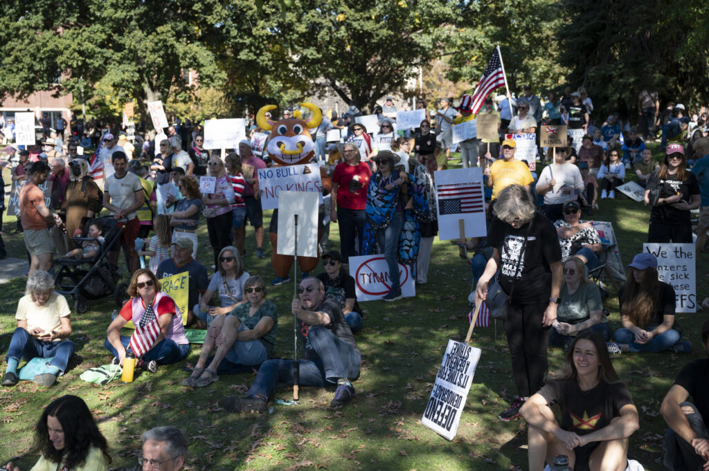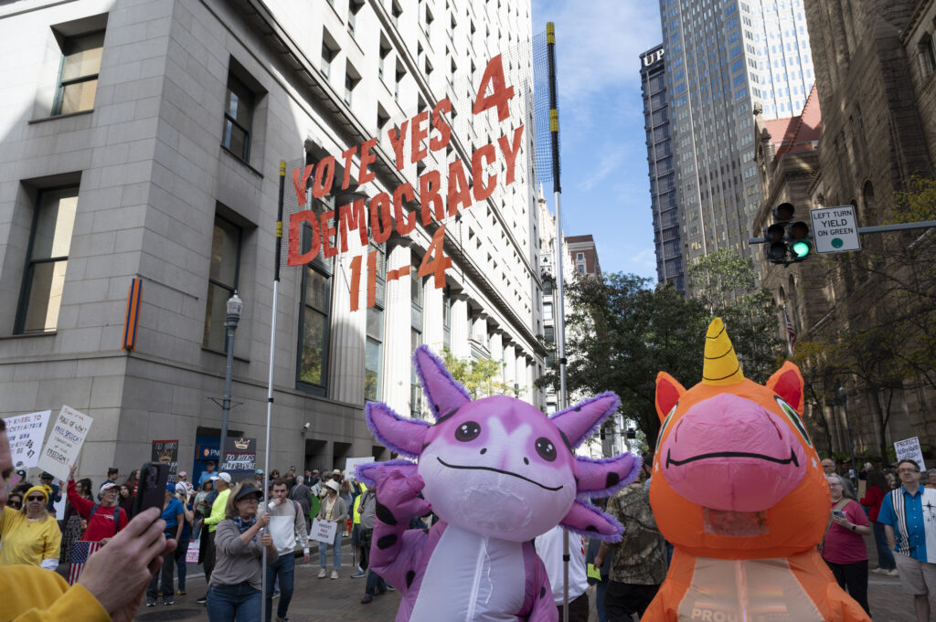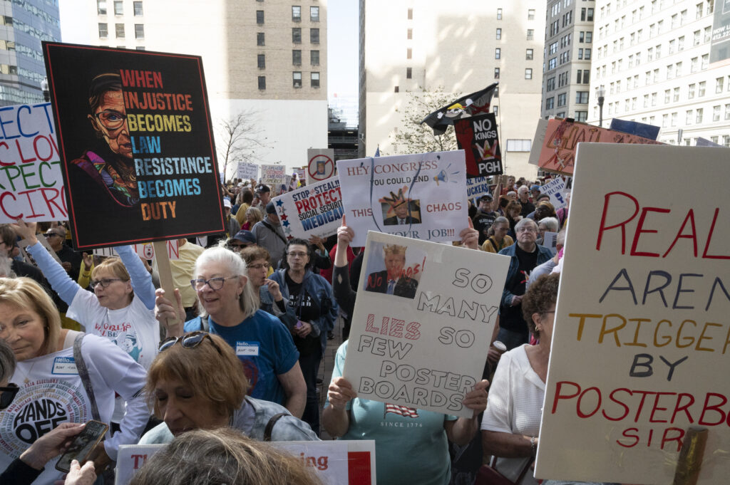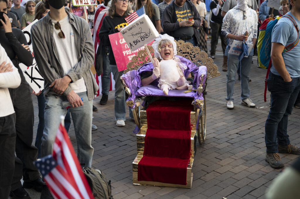 Pittsburgh joined in on the nationwide ‘No Kings’ protests today, with thousands gathering in front of the City-County Building downtown and Allegheny Commons Park on the Northside. The downtown protest, organized by Indivisible Pittsburgh, featured remarks from Congresswoman Summer Lee, County Executive Sara Innamorato, Congressman Chris Deluzio among other local leaders. Protesters filled Grant St. to rally against the Trump administration and hear from local activists and musicians by 1 p.m. before marching to Mellon Square. The protest on the Northside, organized by 50501, also drew a large crowd of people, some dressed in animal costumes holding signs that read “No Kings in Pittsburgh” and “Grab him by the Epstein files.” Jaime Martinez of Casa San José spoke on the many injustices he has noticed in the community surrounding ICE and the importance of standing up for your neighbors.