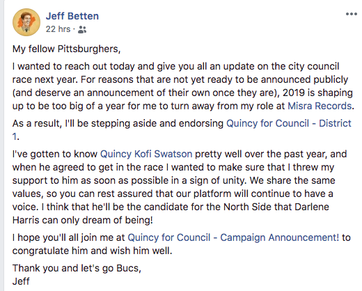 Among his early supporters is Jeff Betten of the Pittsburgh-based music label, Misra Records, who announced his own bid for the 1st District City Council seat last fall. In a post on his campaign Facebook page, Betten endorsed Swatson after dropping out of the running due to professional obligations.