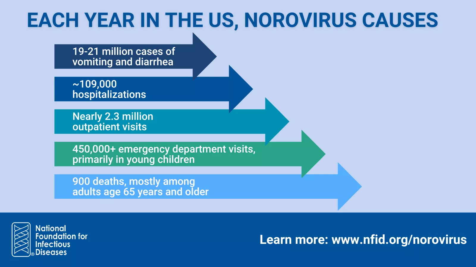 According to the National Foundation for Infectious Diseases (NFID), norovirus accounts for over 450,000 Emergency Department (ED) visits annually. By age 5, 1 in 40 children will have visited an emergency room due to norovirus. “The most important threat of illness with norovirus is dehydration,” Snyder notes. “Young children, older adults, and people with other medical conditions are at the highest risk of complications. Dehydration can result in dry mouth, dizziness when standing, and decreased urine. Seek medical attention if you cannot keep up with replacing fluids or symptoms that last more than 3 days.”