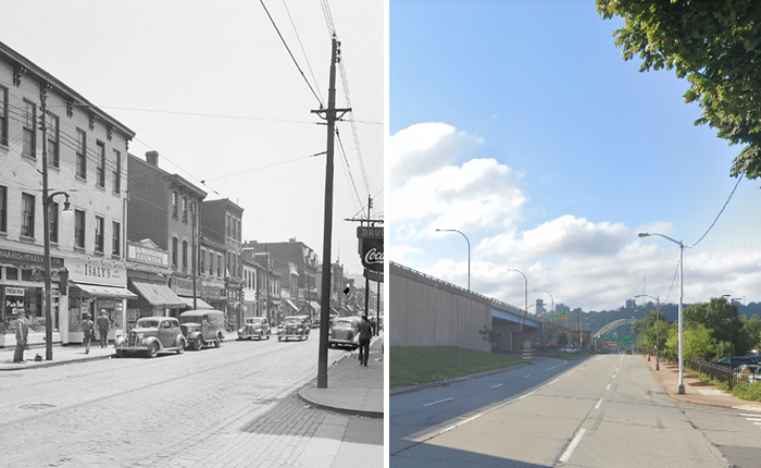 Throughout the 20th century, highway construction made casualties of several other Pittsburgh neighborhoods — usually those with high proportions of people of color. Fifty years earlier, Pittsburgh’s thriving Chinatown community was ripped apart to make way for the Boulevard of the Allies, running from Downtown to Oakland. Several years after the Ohio River Boulevard tore through Manchester, another North Side community, Deutschtown, was similarly carved up by the construction of I-279.