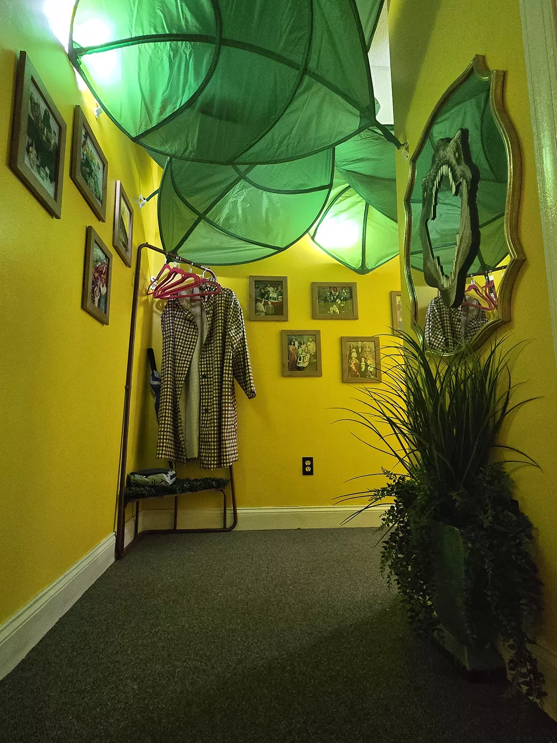 A nook with a coat rack and green canopy — nicknamed “the Family Tree” — displays Zimmerman’s own family photos. Her blended family of seven gets together annually for a group Halloween portrait, with a theme assigned by her 12-year-old daughter, Mia. (One portrait with a The Nightmare Before Christmas theme has Zimmerman dressed as Oogie Boogie.)