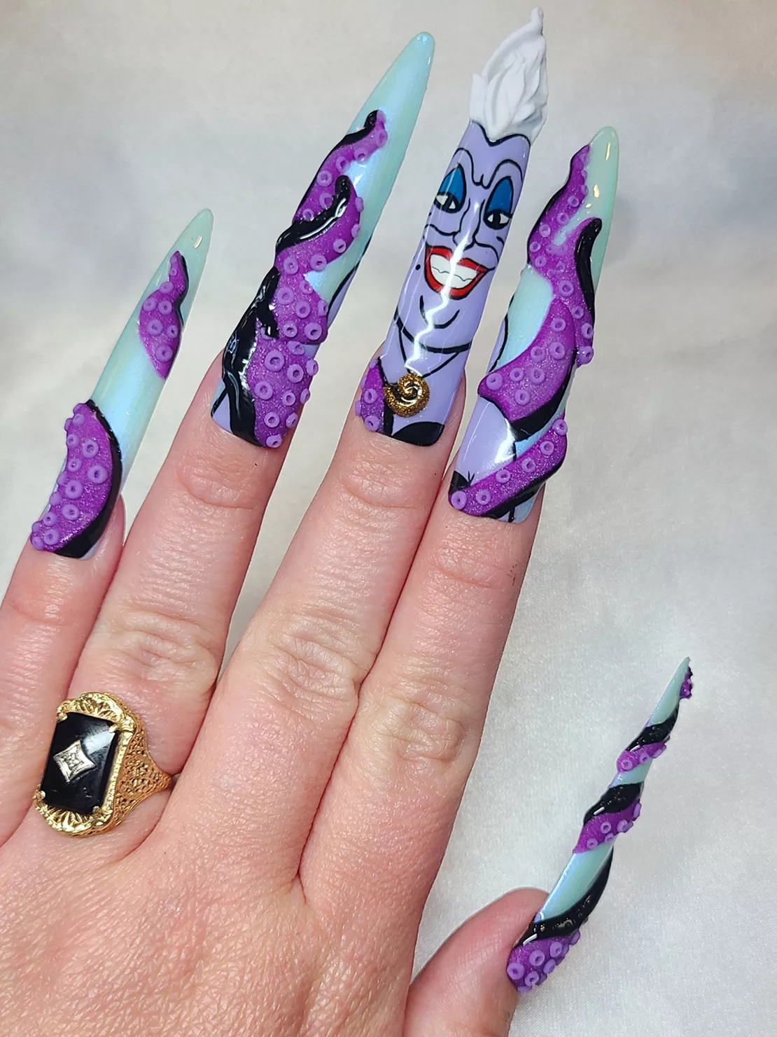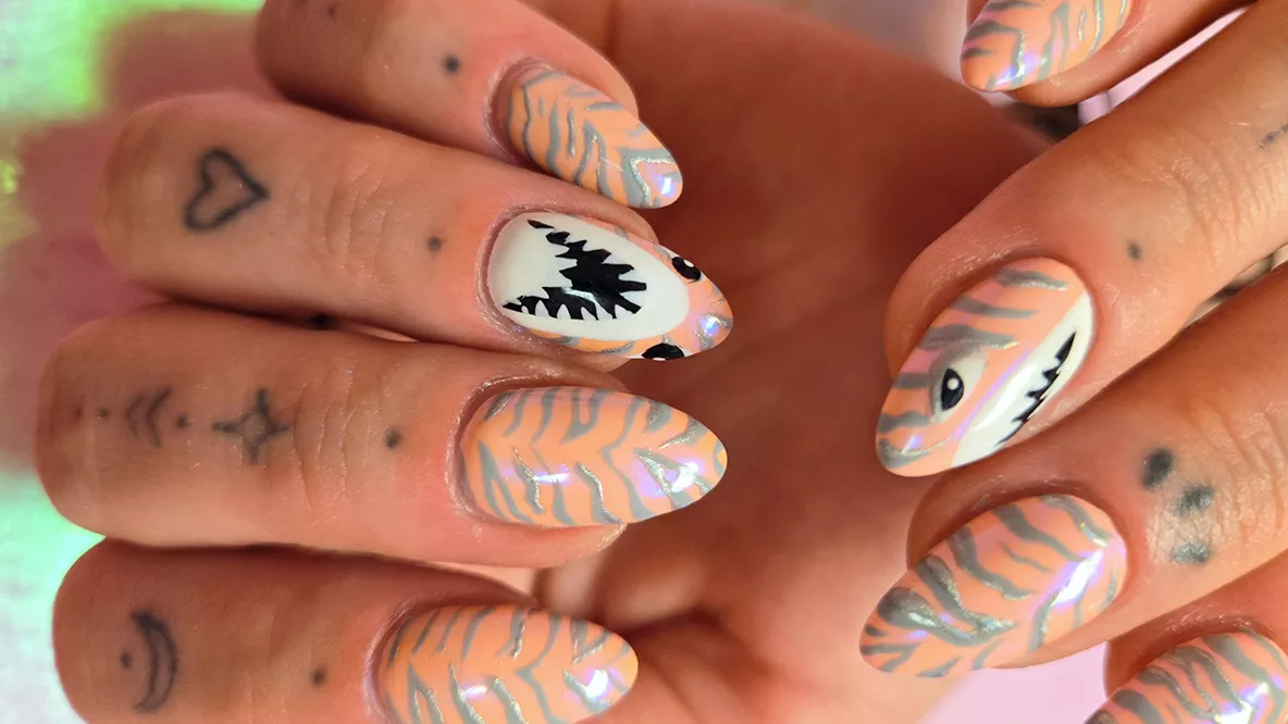 The studio’s services range from a classic manicure to glitter art and accents to custom pet portraits. Recent nail art shared on the studio’s Instagram includes tiger-striped nails with a tiger shark and an intricate design featuring Disney’s Maleficent.